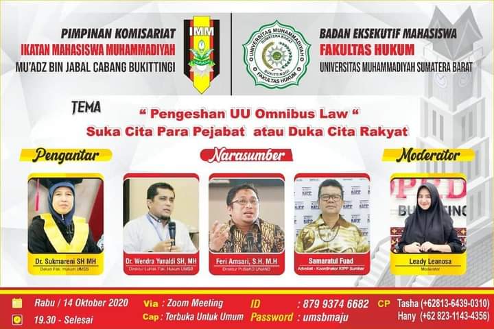 Oleh karena itu PK IMM MUADZ BIN JABAL Cabang Bukittinggi dan BEM Fakultas Hukum UMSB membuka ruang diskusi dan mengkaji lebih dalam terhadap UU Omnibus Law Ciptaker. Mengangkat tema Pengesahan UU OMNIBUS LAW "Suka Cita Pejabat atau Suka Cita Rakyat”. (Rabu, 14/10/2020)