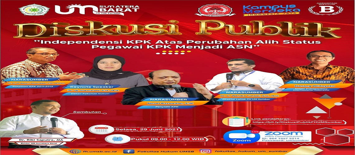 FAKULTAS HUKUM UM SUMBAR- Fakultas Hukum Universitas Muhammadiyah sumatera Barat adakan diskusi public bertemakan “Independensi KPK Atas Perubahan Alih Status Pegawai KPK Menjadi ASN”, Selasa 29 Juni 2021 yang dilaksanakan secara daring melalui Zoom Meeting.