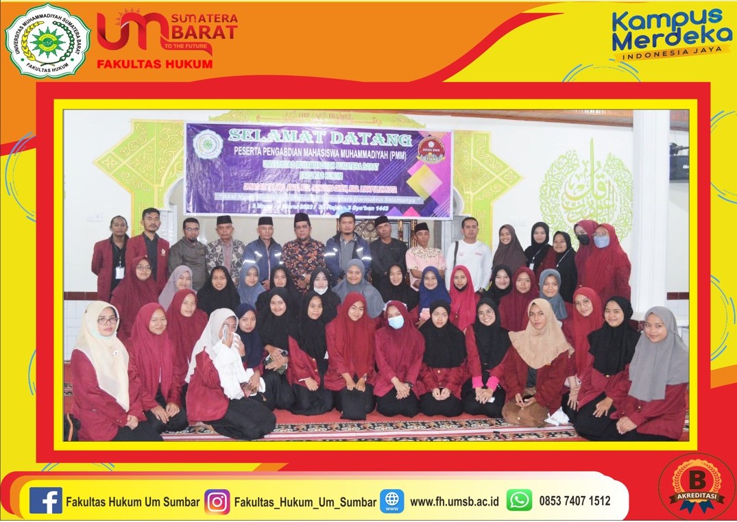 Fakultas Hukum UM Sumbar - Pengabdian Mahasiswa Muhammadiyah (PMM) adalah kegiatan tahunan Fakultas Hukum Universitas Muhammadiyah Sumatera Barat, dimana kegiatan ini bertujuan untuk mengarahkan peserta PMM untuk mampu mengabdi dan bersosialisasi ke masyarakat sebagai Kegiatan Semi KKN.