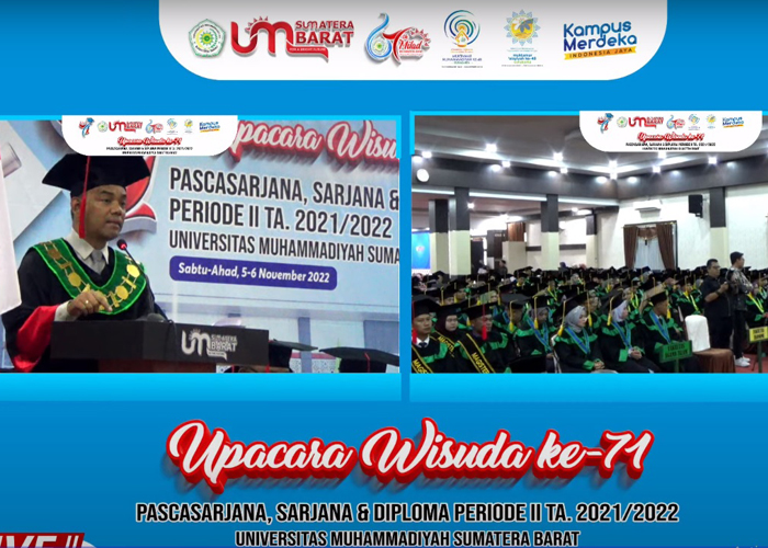 FH UM Sumbar - Universitas Muhammadiyah Sumatera Barat menggelar Wisuda Periode Ke-2 Angkatan ke 71 TA 2021/2022 di Convention Hall Syafii Maarif kampus 1 Padang yang dibagi menjadi 2 sesi yakni pada tanggal 5 dan 6 November 2022. Dilaksanakannya wisuda menjadi 2 sesi mengingat jumlah dari wisudawan/ti pada periode ini yang jumlahnya banyak kemudian mengingat kapasitas convention hall yang dimiliki. Ada sekitar 583 orang wisudawan/ti yang mengikuti proses seremonial tahunan ini.