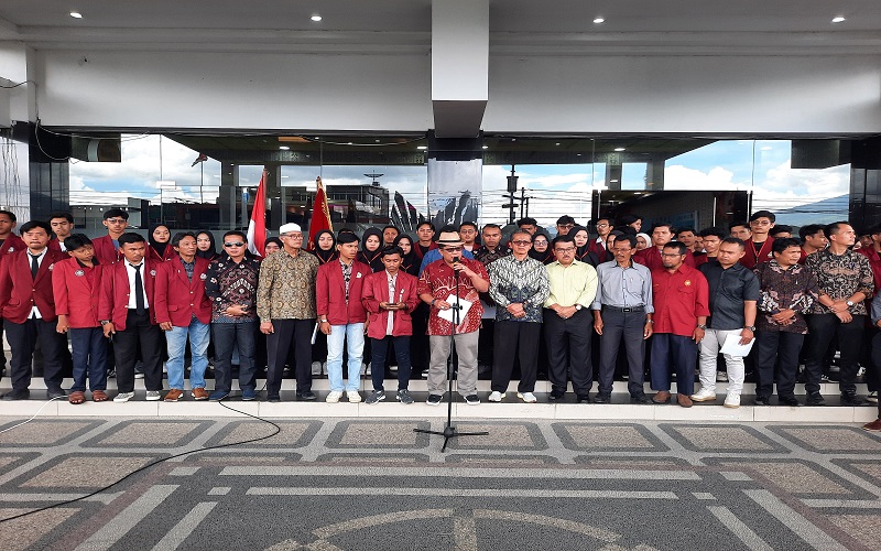 Riko membacakan "Mengamati hiruk pikuk dan isu politik menjelang Pemilu dan Pilpres 2024, maka kami sivitas akademika UM Sumatera Barat, menyatakan sikap sebagai berikut:"