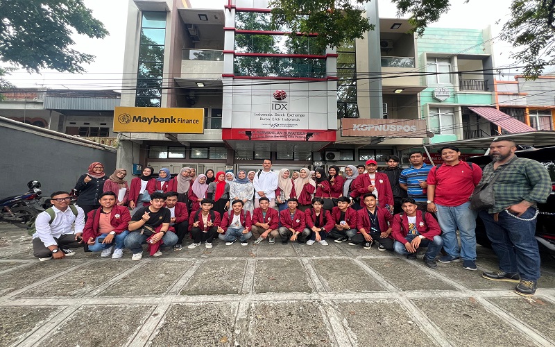 FH UM Sumbar - Mahasiswa Fakultas Hukum UM Sumbar melakukan kegiatan kuliah lapangan di kantor IDX/ Bursa Efek Indonesia perwakilan Sumatera Barat pada hari Rabu (28/5). Hadir dikesempatan itu 58 orang peserta yang terdiri dari mahasiswa Reguler dan juga Non Reguler. Kuliah lapangan ini merupakan pembelajaran dari matakuliah penjurusan Perdata yaitu Hukum Bisnis Digital.